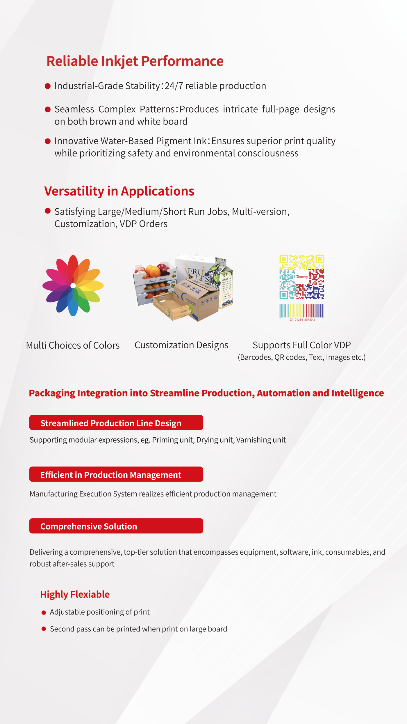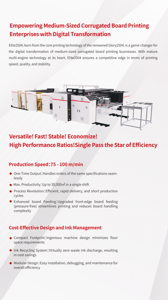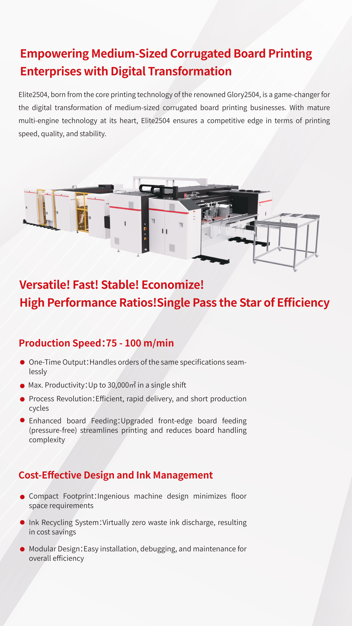 La Elite 2504, evolución de la tecnología de impresión de la reconocida Glory2504, es un punto de inflexión para la transformación digital de las empresas de impresión en cartón ondulado de tamaño medio, la Elite 2504 garantiza una ventaja competitiva en velocidad, calidad y estabilidad de impresión.